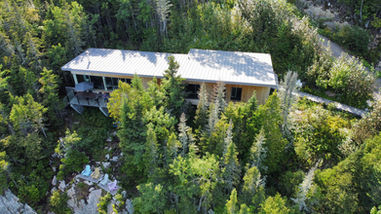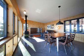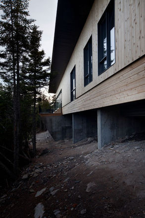 Déposé sur le roc, aux abords du fleuve Saint-Laurent, le chalet Panorama est un espace LEED OR conçu en harmonie avec son site. Le parti fut d’assoir la majorité du chalet sur des lames de béton, afin que l’eau puisse s’écouler naturellement en-dessous. Dédié à un usage locatif, le choix d’avoir un seul niveau s’est imposé. Cette enfilade d’espaces a permis d’avoir une portée simple. Les murs de bois massifs, la dalle de béton chauffante, le mur rideau en bois orienté au sud-est, le débordement du toit et plusieurs équipements récupérés d’un ancien couvent créent un environnement confortable, lumineux et vivant.