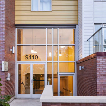 Implantée sur un coin de rue, cette nouvelle ressource d'hébergement est à l'image de son nom, chaleureuse et lumineuse. La couleur accent jaune et la brique aubergine s'inspirent des couleurs vives et chaudes des pays d'origine de certaines résidentes. L'entrée en retrait se veut enveloppante, protectrice et privée. Ce sentiment de privauté est aussi exprimé par les panneaux opaques blancs qui ferment les garde-corps des balcons.