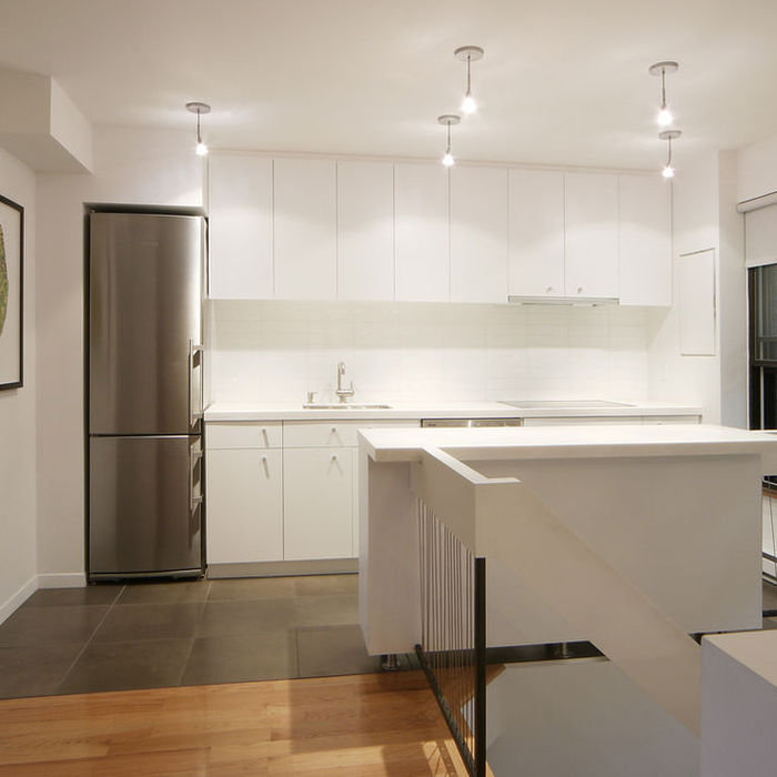 Les propriétaires de ce condo souhaitaient amener lumière et effet de grandeur aux espaces existants restreints. Notre intervention se devait d’aller droit au but : apporter de la luminosité et de la perspective à la cuisine et à la salle à manger. Nous avons donc opté pour décloisonner la cuisine, en l’ouvrant sur l’escalier adjacent et visuellement sur la salle à manger. L’ouverture visuelle qui en résulte donne du souffle aux espaces autrefois confinés. Le mobilier de mélamine blanche permet de garder un budget bas; en y juxtaposant des comptoirs de corian, une porcelaine rectifiée et un nouveau garde-corps en câbles d’acier, celui-ci se fond à une toute nouvelle cuisine épurée et chic.